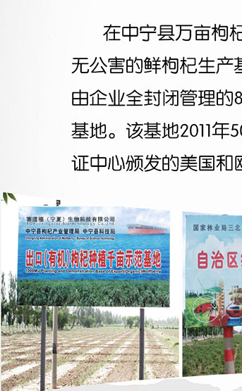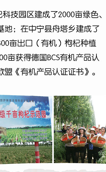 我公司得益于銀川市金鳳區(qū)政府各部門領(lǐng)導的關(guān)愛與扶持,逐漸成長為國內(nèi)枸杞行業(yè)集種植、加工、銷售于一體的較大規(guī)模的民營企業(yè)之一,我們努力爭創(chuàng)農(nóng)業(yè)產(chǎn)業(yè)化國家重點龍頭企業(yè)、寧夏回族自治區(qū)農(nóng)業(yè)產(chǎn)業(yè)化優(yōu)秀龍頭企業(yè)、寧夏枸杞知名品牌企業(yè),農(nóng)產(chǎn)品流通骨干企業(yè)。