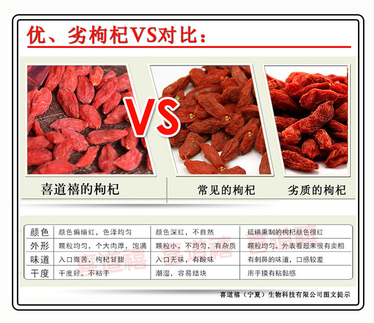 (備注:該對比圖只是好枸杞與一種劣質貨的對比情況,全國市場中,劣質枸杞的表現形態還有好多種賣相。)