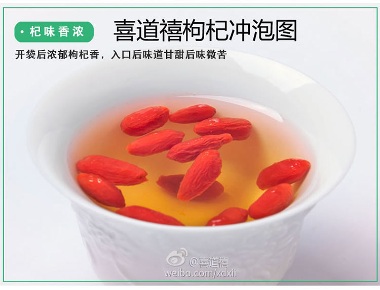 ■大小:通常,寧夏枸杞的顆粒不是很大。如果果粒過大,俗稱“小尖椒”,那就不是寧夏枸杞。一般寧夏枸杞的果粒不是特別的大,寧夏獨有的經緯度、地理、氣候條件、水源及土壤所含有的微量元素等等綜合要素造就了寧夏枸杞獨有的最佳藥用價值,但相對產量較低。這就是為什么正宗寧夏枸杞的價格是一個檔次、正宗寧夏有機枸杞的價格又是另一個檔次!喜道禧枸杞,好枸杞可以貴一點。