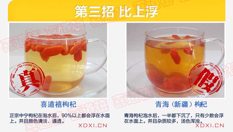 ■泡水:正宗寧夏枸杞含有適度的枸杞多糖,內比重恰到好處。水泡法:將枸杞泡水,看看有沒有下沉,及水色情況;如果發現大量枸杞下沉,則表示不是寧夏枸杞,如果水色變成鮮紅色,則要注意染色和熏制處理,淡黃色表示正常。
