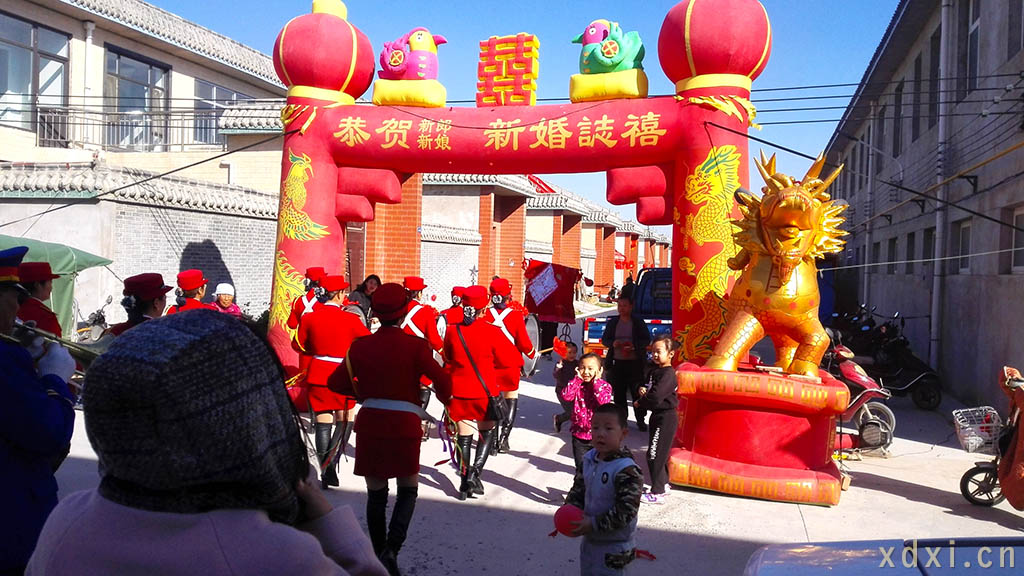 “囍”字,更多地用于婚嫁場合渲染氣氛。囍為兩個喜字相合,含有夫妻恩愛、天長地久之意,囍字自然就成為婚姻的代名詞。在傳統婚俗中,迎親之日,男女雙方各在自家門、街門粘貼大紅囍字,在新婚喜居的街門道口安置大型紅色拱門,門頭上有“新婚誌禧”,赫然醒目。