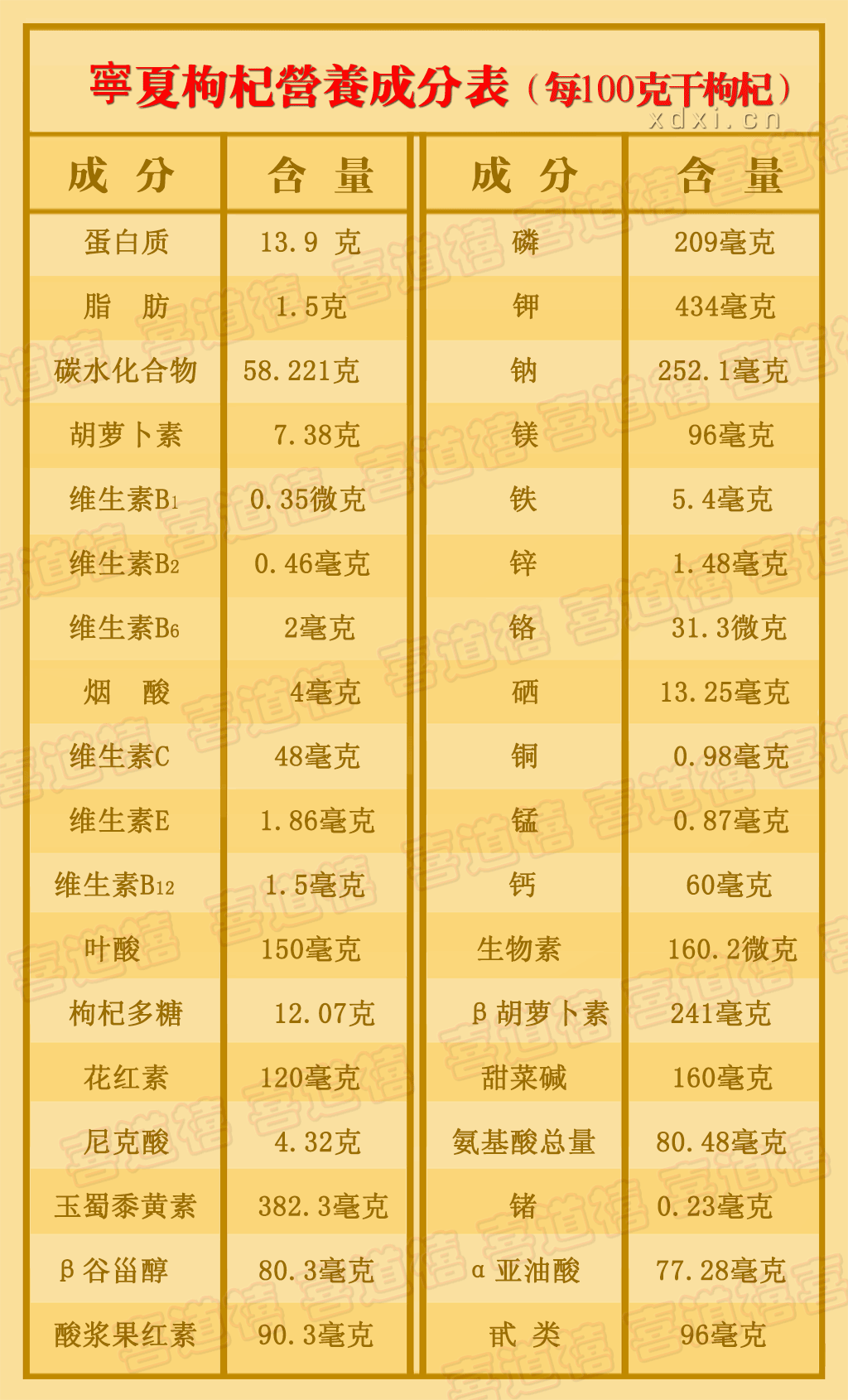 同時,又因為生產(chǎn)工藝的不同,如普通日照晾曬工藝、室內(nèi)高溫風干工藝、室內(nèi)常溫風干工藝、密閉低溫風干工藝、密閉低溫凍干加風干工藝等的不同,導致枸杞干制品的營養(yǎng)成分又有很大的不同和變化,加上各個階段的鮮枸杞的干制品的內(nèi)容物及所含營養(yǎng)成份更有很大變化,現(xiàn)將夏季每100克喜道禧枸杞干果中所含的營養(yǎng)成分公布如下表,這只是若干化驗中的某一次化驗結(jié)果。