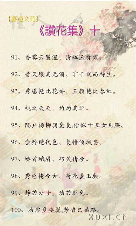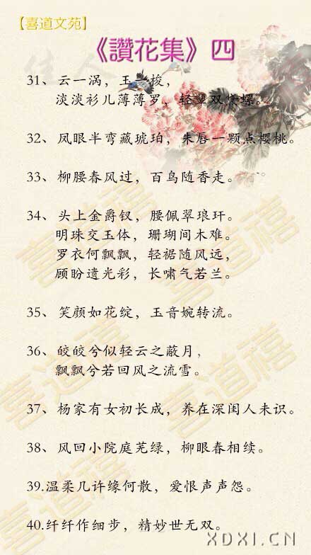 聽風嘆茶,潤雨撫慰,尚綣花濃意滿間,于眼與心,昳麗婉約通靈犀,箐菁婕妤閃榮曜,順雱禧運:水運、財運、花運。菁花郎,金玉皆滿堂!佳人有約,探花忙。