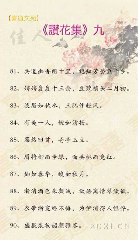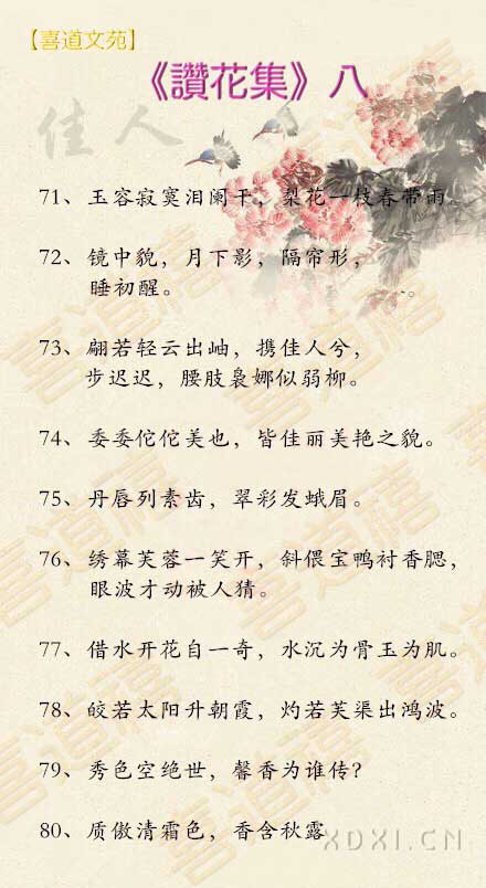 春窗曦雨,嘆茶蒔花香,宓歷飄香覽偲,囿有情愫,凝眸聆籟徜徉,彧思漣漪香婠(wan),曾幾何時,眸然回首,亭亭玉立,玉留香。有艷淑娪花月下,交情同意心和諧,豆蔻之花季;家業有成染滄桑,收獲之中年;天邊獨酌,敬相思;紅顔倚閣,望君歸。卿本佳人,愛意何?情結嬅綺麗,春墨染惇芳,細雨追花郎,花月夜。微婳霍奕,別鶩分奔暢。